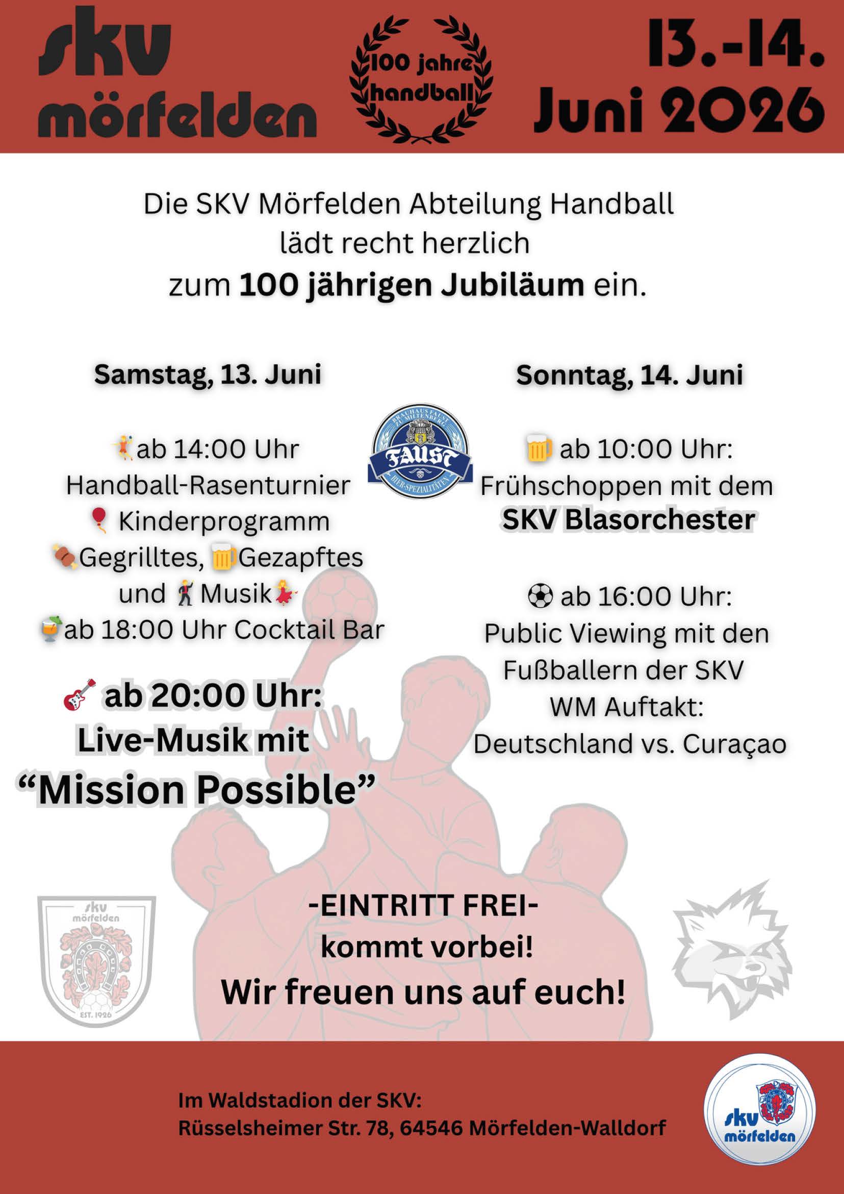 100 jähriges Jubiläum der SKV Abteilung Handball Am 13. und 14. Juni 2026 feiert die SKV Abteilung Handball ihr 100 jähriges Jubiläum. Das Jubiläum wird im SKV Waldstadion gefeiert. Kommt vorbei und feiert mit.