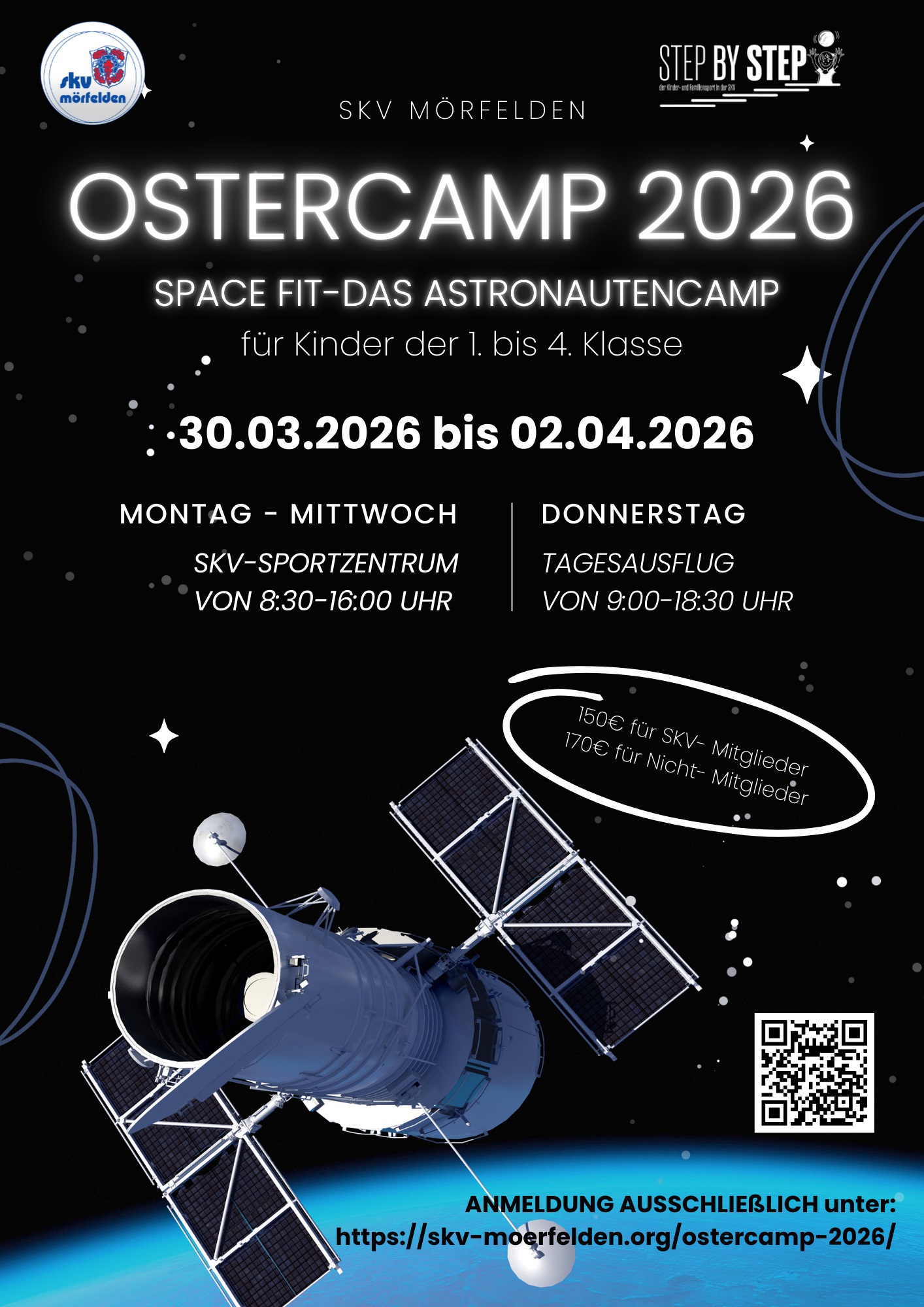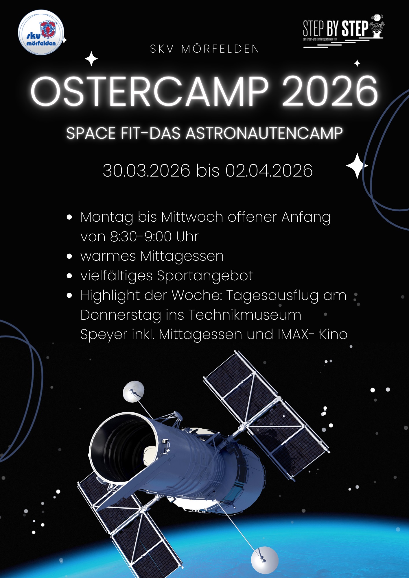 Dieses Jahr findet das Ostercamp der SKV Mörfelden unter dem Motto „Space Fit- Das Astronautencamp“ für sportbegeisterte Kinder von der 1. bis 4. Klasse statt.